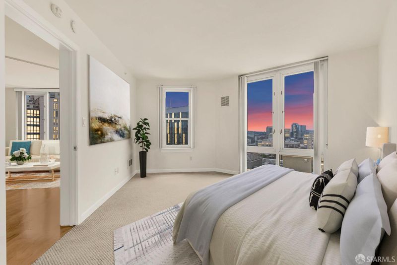Welcome to Residence #1204 at The Sutterfield, a full-service luxury building in San Francisco's vibrant Lower Pacific Heights. This 2-bedroom, 2-bath condo features an efficient split-bedroom layout ideal for privacy and functionality. Expansive floor-to-ceiling windows-several newly replaced-flood the home with natural light and frame sweeping city views, including City Hall, downtown high-rises, and a peek at the Bay. The interior has been freshly painted, and the living room's hardwood floors have been beautifully refinished, creating a crisp and modern feel throughout. The kitchen offers classic marble countertops and abundant cabinetry. Both bedrooms are generously sized en-suites, including a spacious primary suite with a walk-in closet and a bathroom with dual vanities, a soaking tub, and a separate shower. In-unit laundry and one-car garage parking complete this move-in-ready home. The Sutterfield provides 24/7 doorman security, a fully equipped fitness center, sauna, outdoor hot tub, shared patio, package receiving, and building-wide high-speed internet. With a 99 Walk Score and 100 Transit Score, enjoy unmatched access to Lafayette Park, Japantown, Polk Street, Hayes Valley, and the Civic Center's cultural institutions.