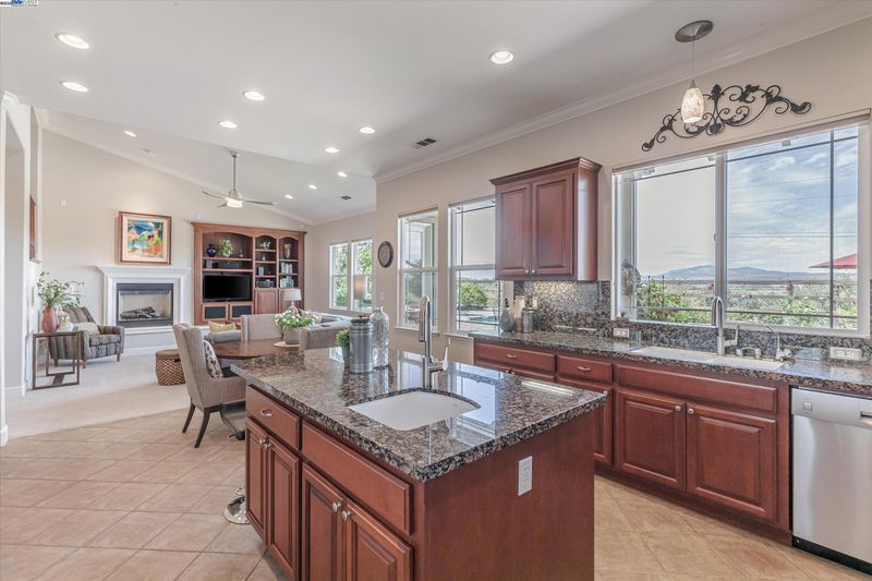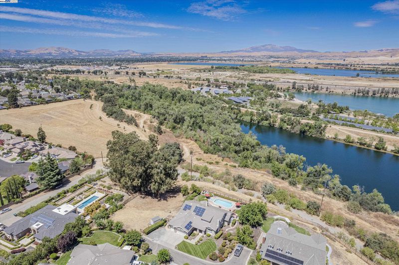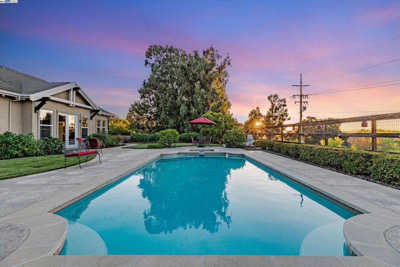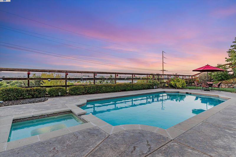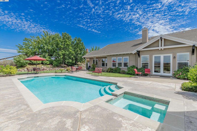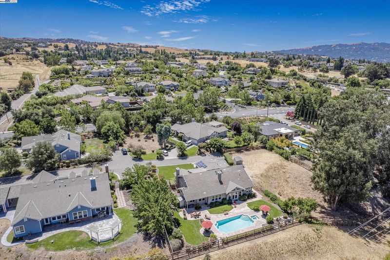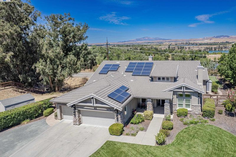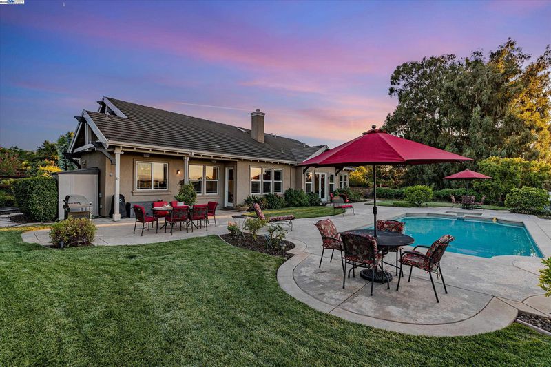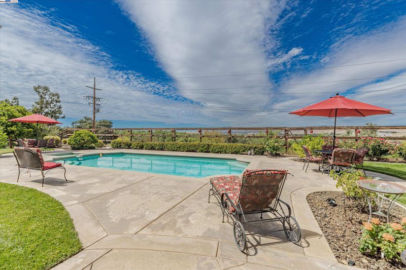 Stunning south facing home on PRIVATE street, NO HOA, no steps to entry. First floor primary bedroom suite. Premium lot with panoramic views of Shadow Cliff Lakes & Mt. Diablo. This home has it all, 4 bedrooms on main level with a large bedroom, bathroom and large loft upstairs. Gourmet kitchen, S/S Wolf double oven (convection), S/S built-in Convection/Microwave oven, Sub-Zero side by side refrigerator, island with veggie sink, separate filtered water, granite countertops with half splash and full splash at stovetop. Culligan water softener owner. Large primary bedroom suite with French doors open to patio, marble countertops, porcelain tiled walk-in shower, dual sinks and large walk-in closet. Large bedrooms with built-in closets. Leased solar system. Sparkling pool/spa spacious salt-finished deck and patios. Professionally landscaped yards, with space for two outbuilding/ADU/RV parking. Perfect for entertaining. Gas stub at patio & wired for low voltage lighting. Too many features to list. Close to downtown Pleasanton, access to Shadow Cliffs from backyard