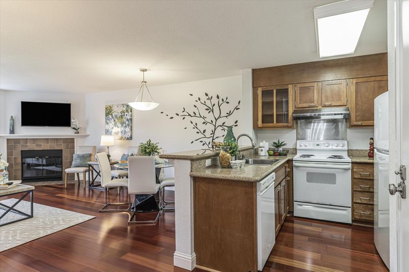 Move right in corner unit with beautiful fountain view. Nothing to do here! Welcome to this adorable condo perfectly located in downtown Fremont, near BART station and Central Park! This is a clean and beautifully upgraded one bedroom one bath second floor unit. The living room open to the dining area has a lovely fireplace with surrounding tile, a large windows, and a sliding glass door to the patio. The kitchen features updated cabinets, granite counters, electric cooktop, dishwasher, refrigerator & breakfast bar. Other features include laminate flooring the in living area, carpeted bedroom, in-unit laundry with washer and dryer included, and updated bathroom with tile flooring, and granite vanity counter. Enjoy the community amenities including a pool, a club house, and tennis courts. Close to Hwy 84, 680 and 880 for convenient commute to Facebook, Google, Silicon Valley, Peninsula or San Francisco. Why rent when you can own this beautiful unit and have it all?