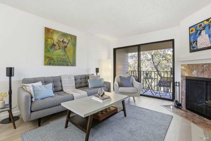 Bright, and move-in ready, this 2-bedroom, 2-bath ground-floor condo in the desirable Spyglass Hill community feels like a treehouse retreat. Though a ground-level unit, the rear of the home is elevated among the trees, offering a private, serene setting and a true connection to nature. With an open floorplan, the kitchen and dining area flow seamlessly into the living space, featuring built-ins in the dining room and a kitchen with stainless steel appliances, ample cabinetry, and a large window. New hardwood flooring runs through all the living areas, with new LVP flooring in the kitchen and bathrooms. Both bathrooms are updated, one with a tiled tub and the other with a spacious walk-in, subway-tiled shower. Spacious bedrooms include a primary suite with a custom closet and a second bedroom featuring a walk-in closet. Additional highlights include a welcoming front porch, private deck with hill views and extra storage, Bosch stackable washer and dryer, wood-burning fireplace, radiant ceiling heating, and newer interior paint. Residents enjoy resort-style amenities including a pool, spa, tennis court, recreation room, bike storage, and saunas. Ideally located near transportation, shopping, the ferry, Corte Madera Creek Path, scenic hiking and biking trails, and easy access to outdoor recreation and nearby destinations including Mount Tamalpaisexperience the best of Marin living.
