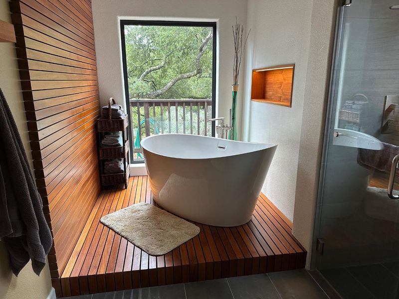 - Double Sinks, Dual Flush Toilet, Marble, Primary - Oversized Tub, Primary - Stall Shower(s), Showers over Tubs - 2+, Stone, Tile, Updated Bath