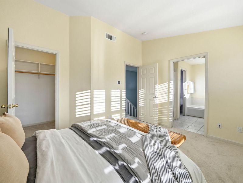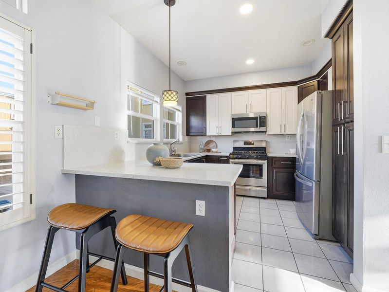 This well-maintained home features 3 bedrooms, 2.5 bathrooms, and 1,448 sq ft of living space, built in 1997, with an attached 2-car garage. The inviting living room offers a cozy fireplace and hardwood floors, flowing into a dining area with an additional fireplace, perfect for entertaining. The kitchen features quartz countertops, tile flooring, a gas cooktop, and built-in storage cabinets. The spacious primary bedroom includes a walk-in closet with mirrored doors. The en-suite bathroom features dual sinks, a sunken tub, and a separate shower. Two additional bedrooms are located down the hall for added privacy, along with a full bathroom featuring a tub-over-shower and tile flooring. Additional highlights include plantation shutters, central A/C, ample garage storage, and an attached 2-car garage. The gated community offers guest parking, a clubhouse, and a pool. The home is close to Meta's shuttle bus stop at the intersection of Stevenson Blvd and Leslie St. and close to Bart. Conveniently located near Lake Elizabeth Park, restaurants, and grocery stores.