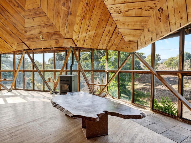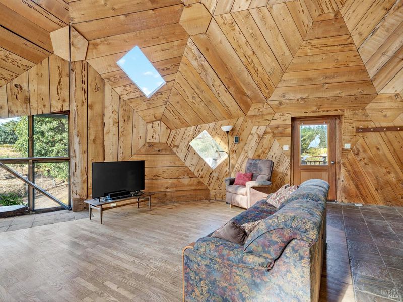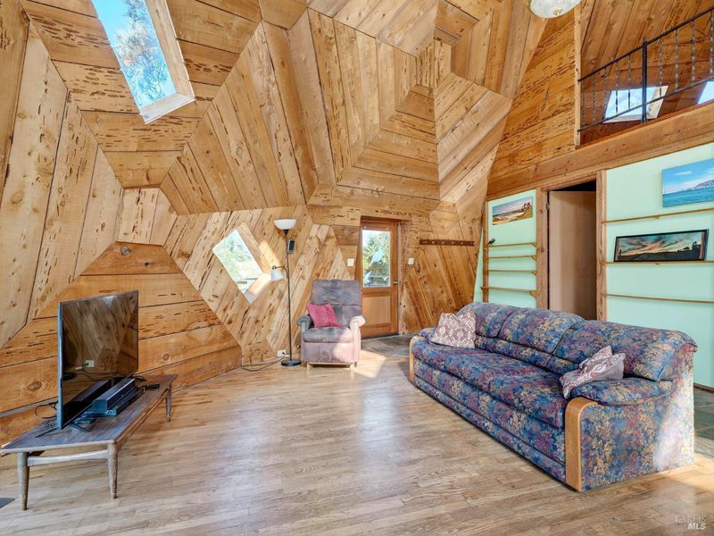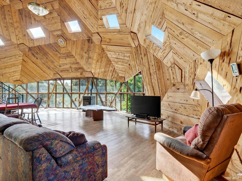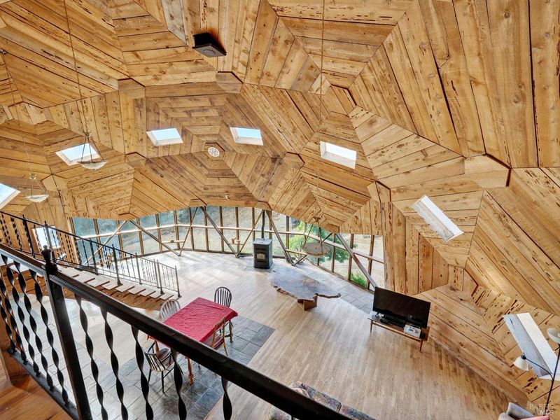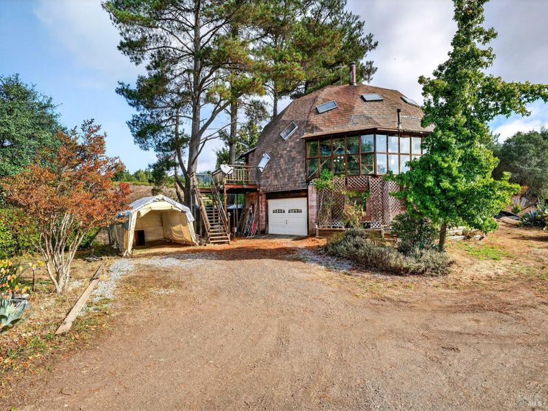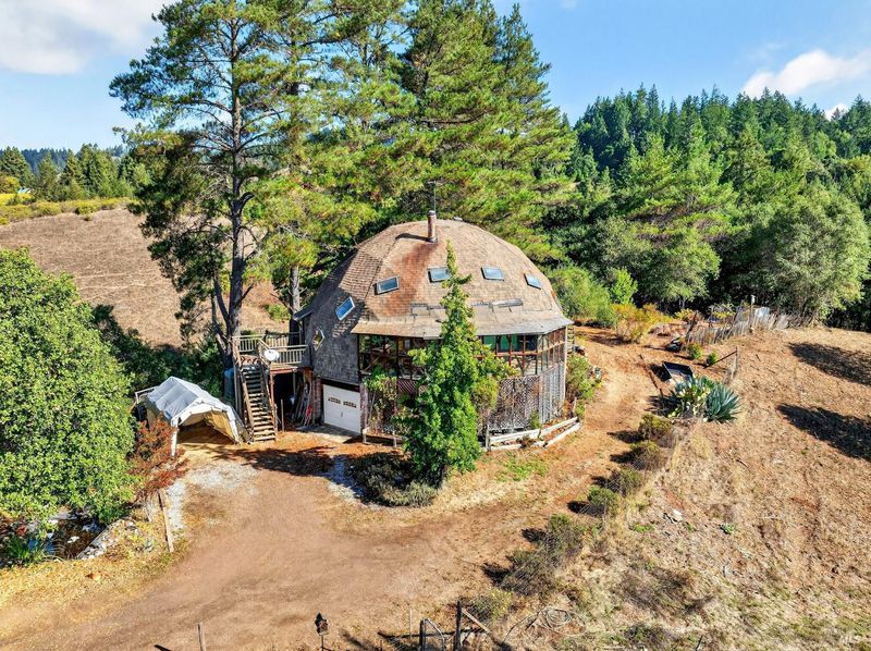 Nestled in the Holmes Ranch community of Philo, this striking geodesic dome sits on approximately 20 acres of serene Mendocino County landscape. Thoughtfully positioned to shield from prevailing winds, the home is perfectly oriented: expansive windows flood the interior with natural lightwelcoming the sun's warmth in winter, yet cleverly designed to avoid direct sunlight during summer. The main living area is spacious and inviting, featuring a pellet stove for cozy evenings and seamless access to the kitchen. The home includes a full-sized basement with multiple access points: a garage door for large items, an interior stairwell, and a convenient lift for transporting groceries and bulky items to the main floor. The primary bedroom and bathroom are located just off the main living space, while the loft above offers three additional bedrooms and a full bath with shower. Outside, enjoy a fenced garden, picturesque views of neighboring vineyards, and a tranquil path leading to the creek below. Located just minutes from Highway 128, this Anderson Valley gem offers easy access to renowned tasting rooms, charming restaurants, and the stunning Mendocino coast.