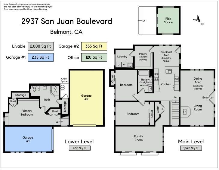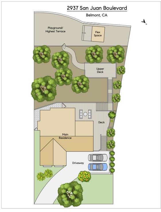 Green Oasis in the Belmont Hills. 2937 San Juan Blvd offers a multi-level haven that seamlessly blends natural beauty with modern comfort in the sought after Haskins Estates neighborhood. Expansive windows and numerous skylights fill the approximately 2,000+/- sqft. interior with abundant natural light, framing views of the homes lush, park-like surroundings. Set on a sprawling 6,685+/- sqft. lot, the property unfolds into a private outdoor sanctuary featuring mature foliage, triple terraced areas, a dedicated play space, an inviting entertainment deck, and a charming studio cottage/flex space ideal for creative work or a quiet retreat. Thoughtfully updated and designed to harmonize with its environment, this exceptional home offers both everyday livability and a rare sense of escape - all within moments of Belmonts restaurants, parks, shopping, and commuter routes. Green Oasis | 3 Bedrooms | 2 Bathrooms | 2,000 +/- sqft | Primary Ensuite with Stall Shower | Multi-Level Spacious Patio Areas | Stone Countertops | Modern Flooring | Centralized Heating and A/C | 2 Garages | Storage Rooms | Convenient Location | Nearby Parks/Trails |