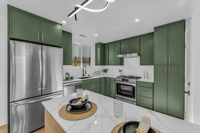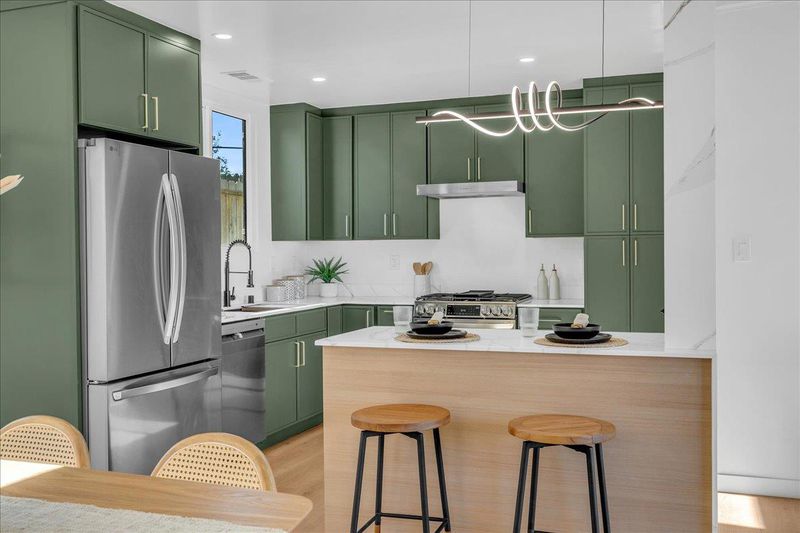 - Countertop - Quartz, Dishwasher, Garbage Disposal, Island, Oven Range - Built-In, Gas, Oven Range - Gas, Refrigerator