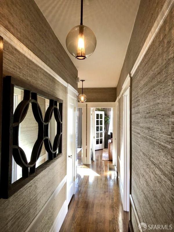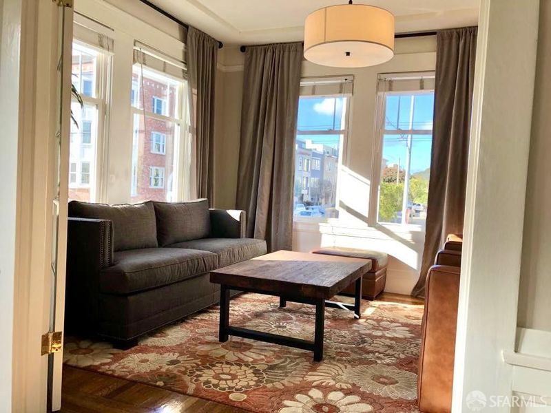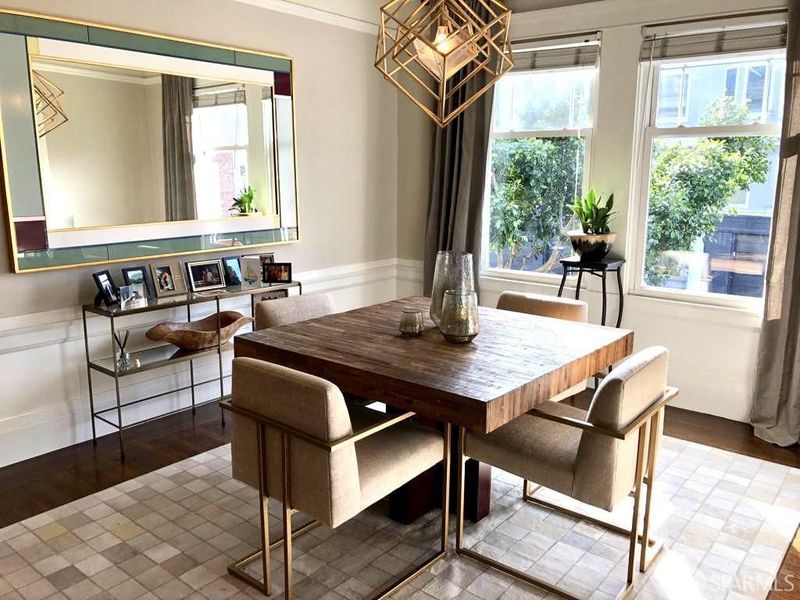 Located in the highly desirable Marina neighborhood, this beautifully appointed residence offers a versatile layout and timeless architecture appeal. Currently configured as a spacious one-bedroom, the residence features a formal dining room with windows and a closet easily used as a second bedroom or home office. Classic period details include hardwood floors, soaring ceilings, and French doors that add charm and character throughout. The floorplan includes a well-maintained kitchen, full bathroom, and a separate living room, creating a natural flow for both everyday living and entertaining. In-unit laundry and a private one-car garage with extra storage add convenience and value. Enjoy low HOA dues and access to a shared rooftop deck with sweeping views of the Golden Gate Bridge and city skyline - an ideal setting for Fleet Week, sunsets, or relaxed outdoor gatherings. The building sits on bedrock in a quiet part of the Marina, just blocks from Moscone Park and steps from the dining, shopping, and nightlife of Chestnut, Union, and Polk Streets. 97 Walk Score.