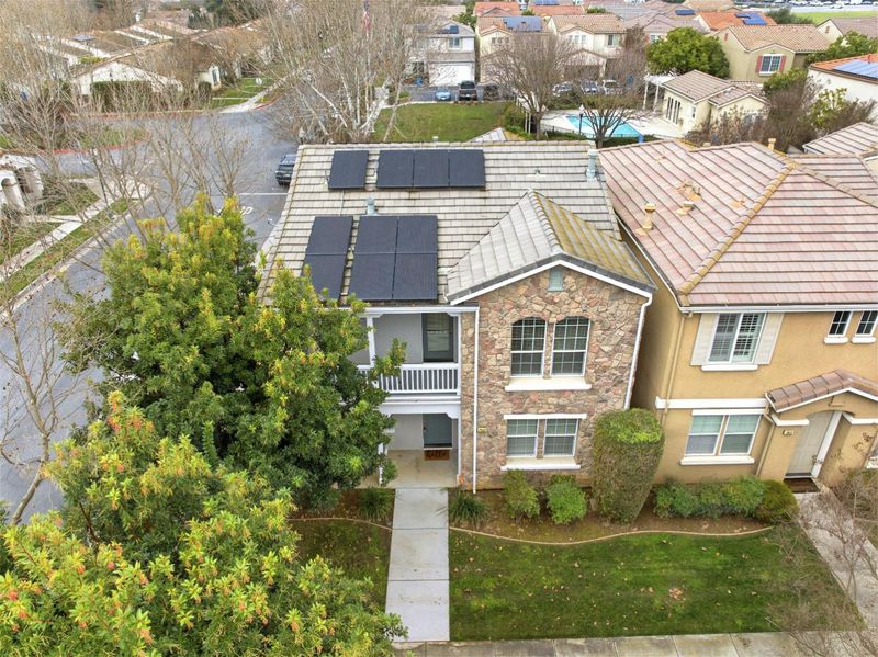 Set on a spacious corner lot with charming curb appeal and a stone facade, this move-in-ready home offers a rare private lanai/patio with open views of the grassy common area, pool, and spa, all in one of the most convenient locations for community amenities. Inside, a bright, freshly painted open-concept layout features a cozy fireplace and flows seamlessly into the dining area and kitchen. The kitchen impresses with granite countertops and ample cabinetry. Approximately $30,000 in upgrades enhance comfort and style, including stainless steel kitchen appliances less than two years old, new wood flooring throughout the first floor, new carpeting upstairs, tile floors in both bathrooms, a full-length mirror on the primary bathroom door, a privacy door enclosing the primary toilet, and a Jacuzzi tub in the primary suite. Additional improvements include a 75-gallon water heater, 10-year smoke detectors, LED lighting in the garage and laundry room, and solar panels for energy-efficient living. Outdoor living is effortless with a covered patio and upstairs balcony, off the primary bedroom. Exterior trim painted in 2024. Ready to unwind? Enjoy the community pool and spa, an escape close to home.