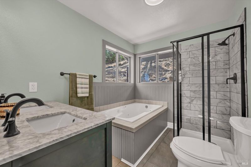 - Double Sinks, Jetted Tub, Low-Flow Toilet(s), Shower Stall(s), Soaking Tub, Tile, Tub, Window