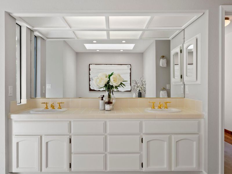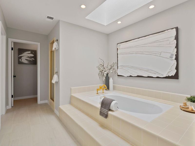 - Double Sinks, Full on Ground Floor, Primary - Oversized Tub, Primary - Stall Shower(s), Showers over Tubs - 2+, Skylight, Split Bath, Tile, Tub in Primary Bedroom, Other
