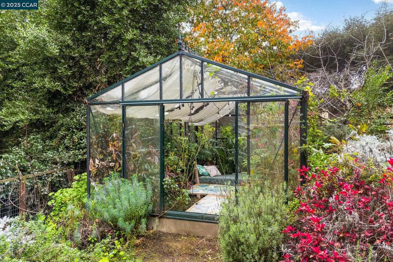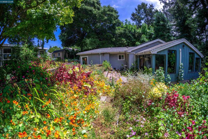 Tucked back from the street on a serene .57-acre lot surrounded by mature trees, vibrant plantings & beautifully tended garden, this single-story retreat offers rare privacy & a bright, welcoming interior. Skylights, exposed-beam ceilings & large windows fill the home with natural light. The open living & dining areas create an airy flow, with French doors extending the space to an expansive deck overlooking the greenery. The updated kitchen features white cabinetry, sleek counters, deep farmhouse-style sink, gas range & breakfast bar. The remodeled bathroom offers a double-sink vanity & modern finishes. Both bedrooms enjoy peaceful views of the surrounding greenery, while one offers direct access to the deck for an easy indoor–outdoor connection. Outdoors, garden paths wind through layered plantings, flowering beds & a whimsical yet practical greenhouse. The homeowners lovingly shaped every corner of the landscape, creating a space that feels both vibrant & peaceful. A storage shed & generous deck add comfort & function. The lot backs to a creek & wooded backdrop, enhancing the sense of seclusion. Minutes to parks, trails, local conveniences, major roadways & nearby BART connections. A rare haven for anyone who loves natural beauty, privacy & a thoughtfully nurtured landscape.