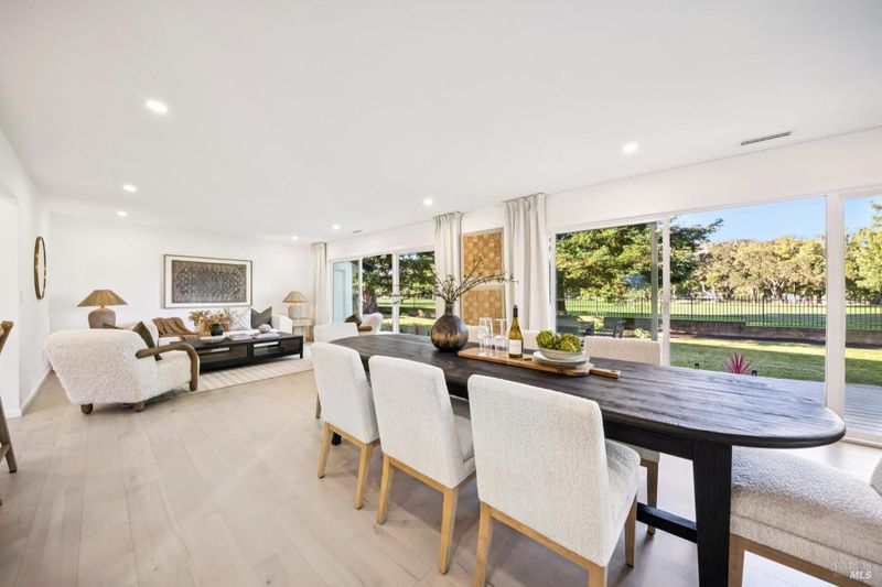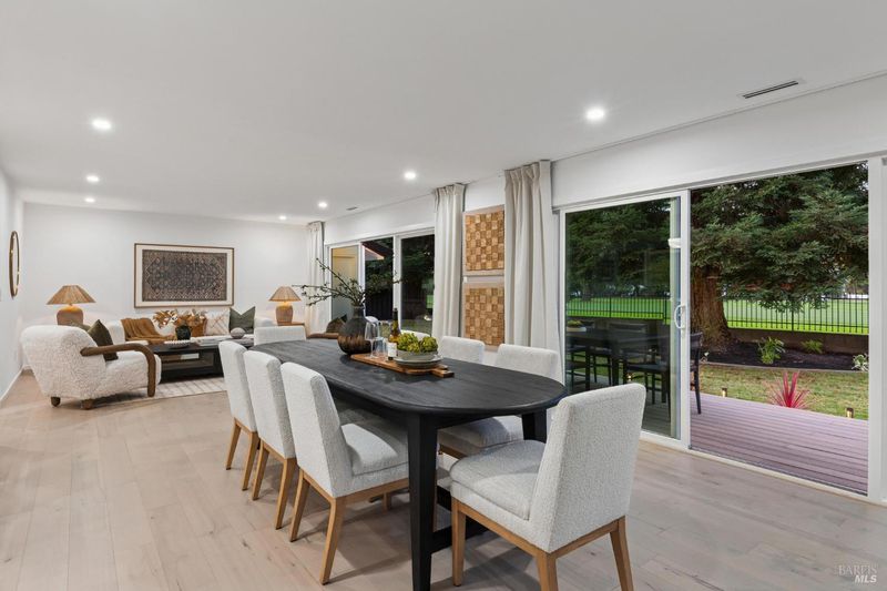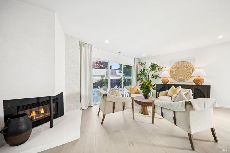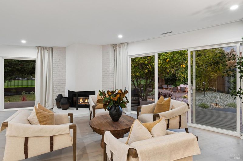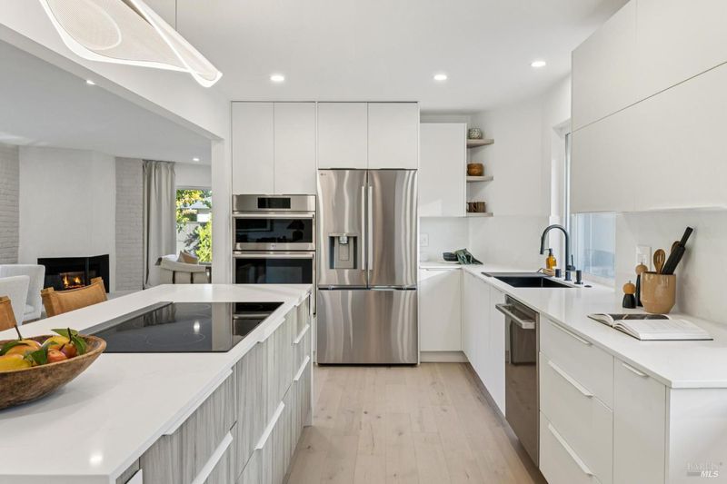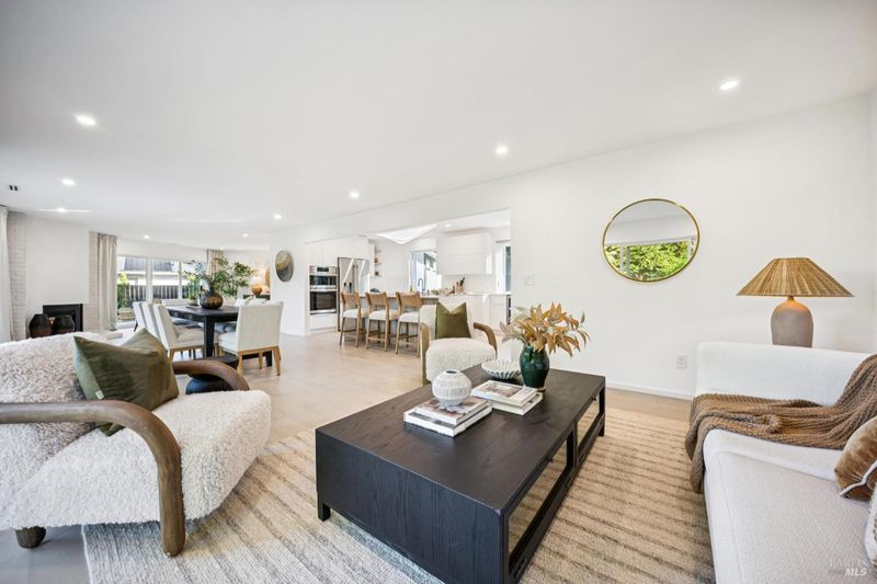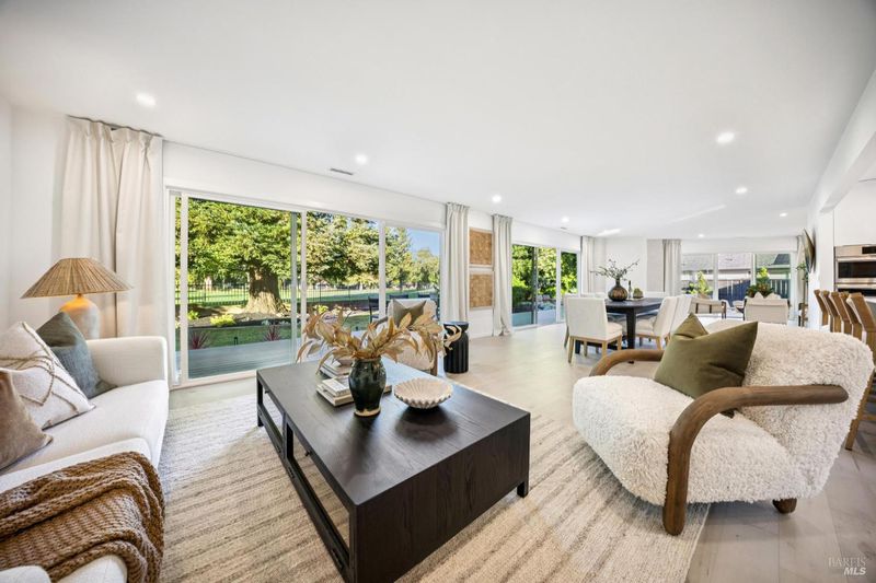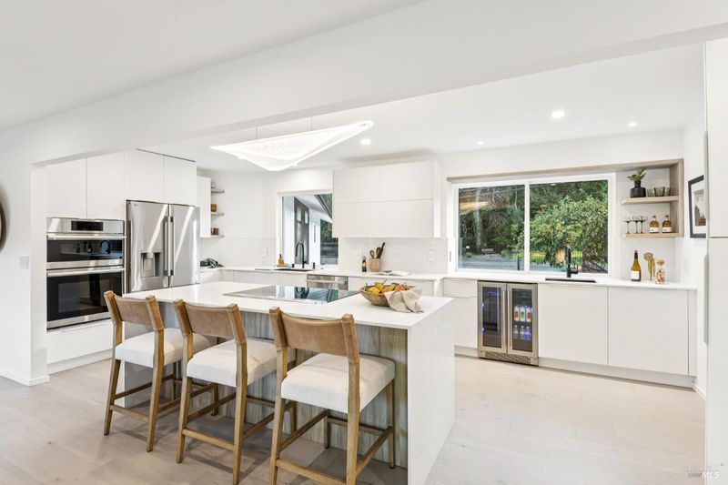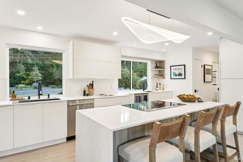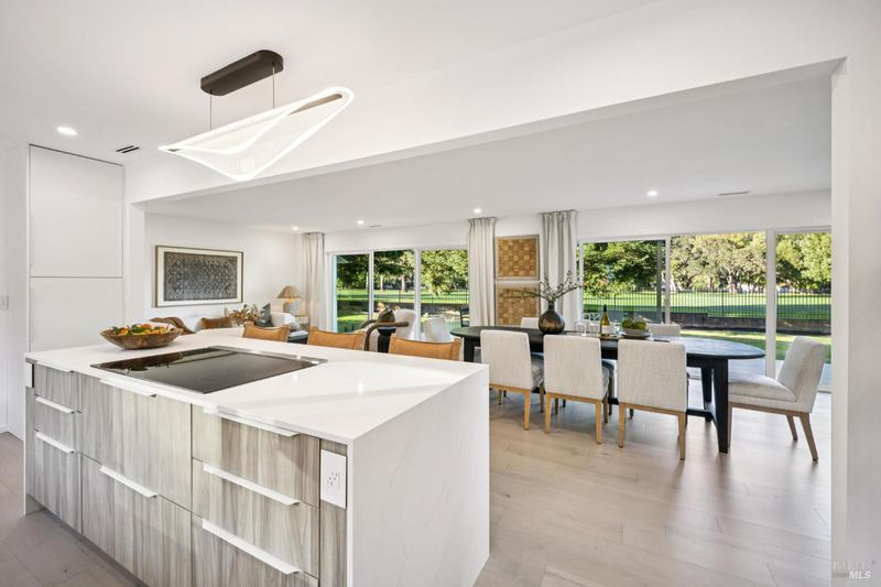 Impeccably remodeled single-level home showcasing modern design, high-end upgrades, and direct views of the Marin Country Club golf course. This 3 bedroom, 3.5 bath residence features new Canadian Maple engineered hardwood floors, smooth-wall finish, solid core doors, and modern dual-pane, energy-efficient doors and windows. The chef's kitchen offers Euro frameless cabinetry, Quartz LumaLuxe countertops, an 8' waterfall island, designer stainless appliances, induction cooktop, and a concealed Zephyr Lift downdraft. A custom bar area with sink and dual-zone beverage refrigerator enhances effortless entertaining. The luxury bathrooms highlight Italian porcelain tile and Hansgrohe fixtures, with heated floors in the primary suite. Additional upgrades include all-new plumbing, new insulation, a 200-amp solar-ready electrical system, Lutron lighting controls, modern LED lighting, a Mitsubishi heat pump, EV charger, and a sleek insulated steel garage door. Walls of sliders create seamless indoor-outdoor flow to a spacious backyard featuring new drought-tolerant landscaping, smart irrigation, landscape lighting, and new fencing. A new semi-circle estate driveway and custom wood details elevate curb appeal. A move-in-ready modern retreat offering elevated living on a quarter-acre lot!