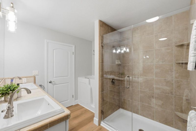 - Double Sinks, Stall Shower, Tile, Tub, Updated Bath, Full on Ground Floor, Half on Ground Floor, Primary - Stall Shower(s), Stall Shower - 2+