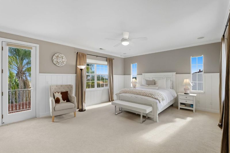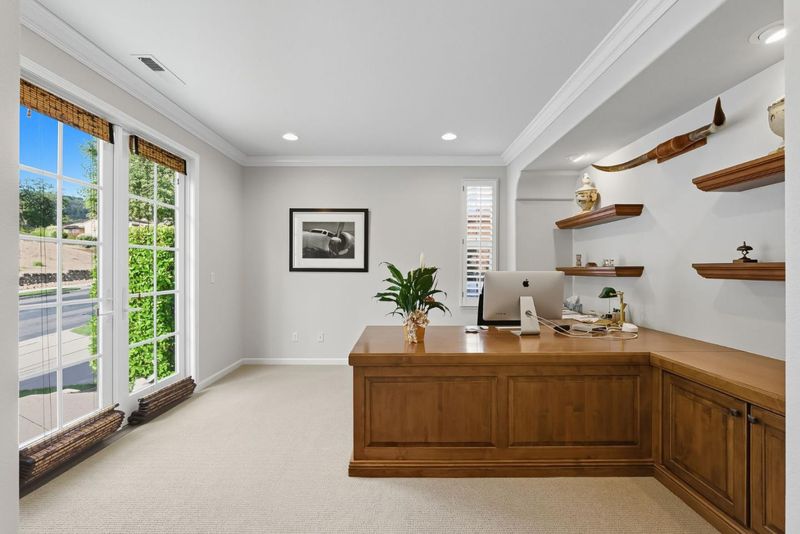 Stunning Eagle Ridge Mediterranean former Shapell model with upgraded options and special landscaping design. It is ideally set across from open space for privacy. Features include hardwood floors, crown molding, custom built-ins, and high-end windows. Gourmet kitchen with large quartz counters, walk-in pantry, and breakfast nook opens to family room with beam ceiling, bay windows, and fireplace. French doors lead to a private courtyard for outdoor dining; backyard offers a sparkling low-maintenance pool. Luxurious primary suite with balcony, spa bath, and custom walk-in closet. Bonus room with built-ins, office, and flexible spaces easily converted to bedrooms. Two gas fireplaces, dual zone for heating and AC, 3-car tandem garage with EV outlet, extra 6 parking spaces available for guests, 32 owned solar panels for minimal utility costs. Located in gated Eagle Ridge with Clubhouse, Pool, Basketball ball court , Tennis courts, Bocce Ball, Organized activities, Parks, Walking Trails, and low HOA fees.