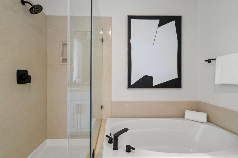 - Double Sinks, Full on Ground Floor, Granite, Shower and Tub, Showers over Tubs - 2+, Stall Shower, Tile, Tub, Updated Bath
