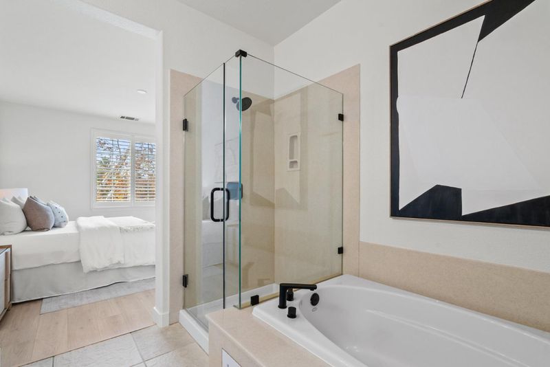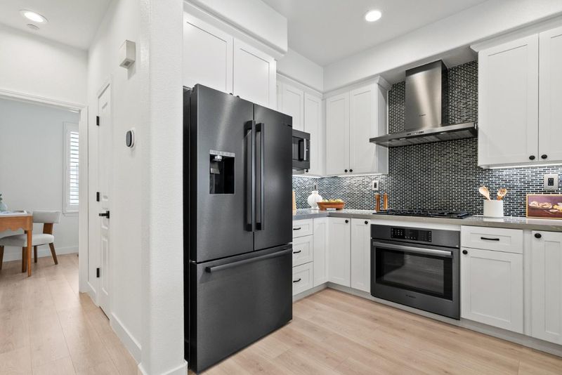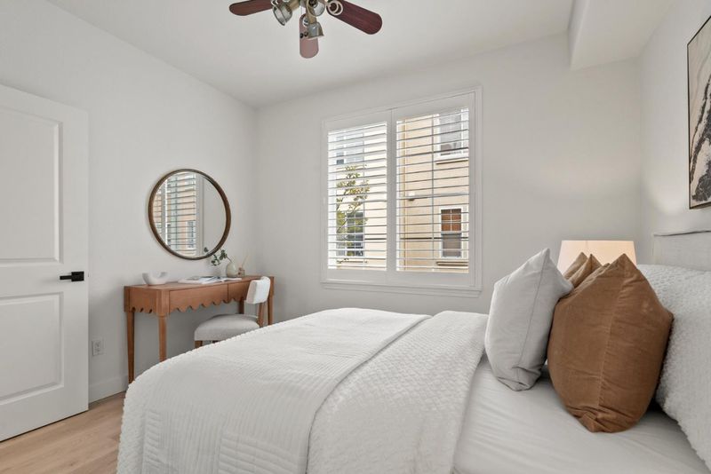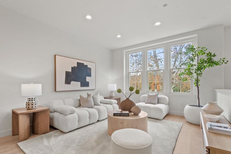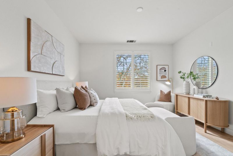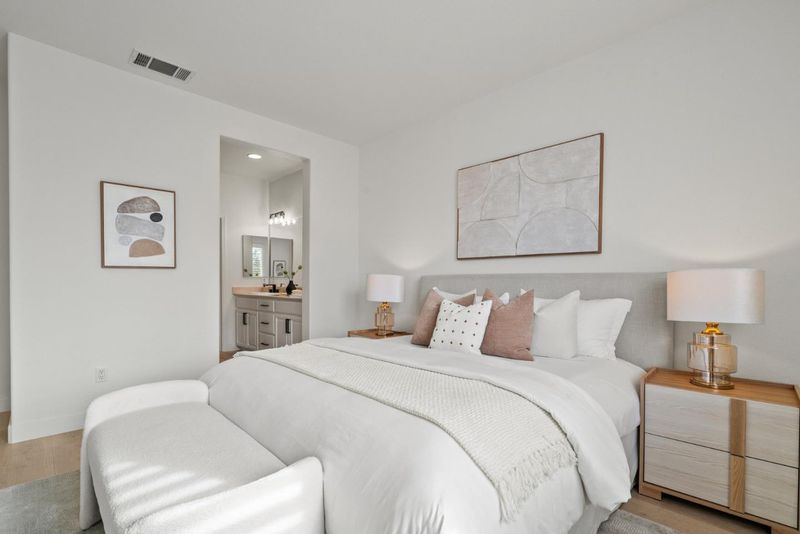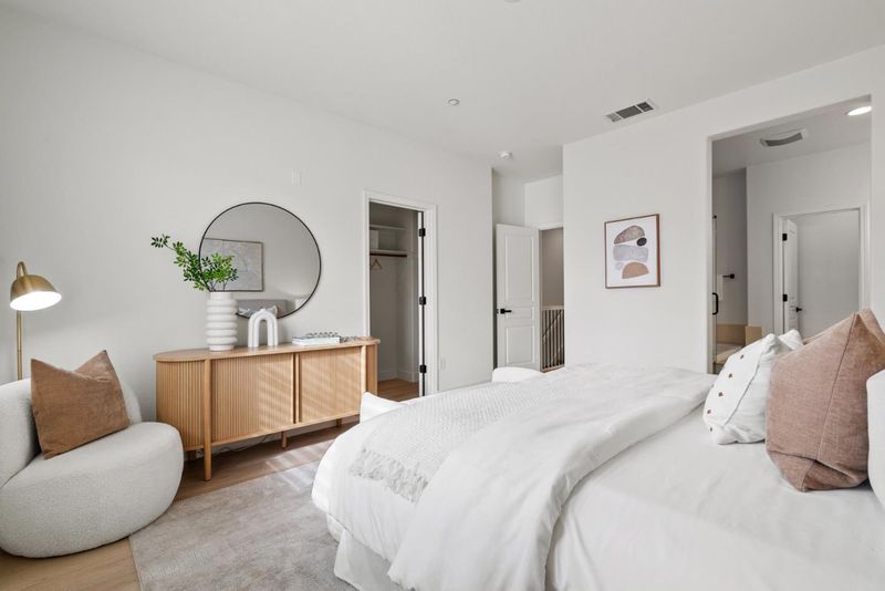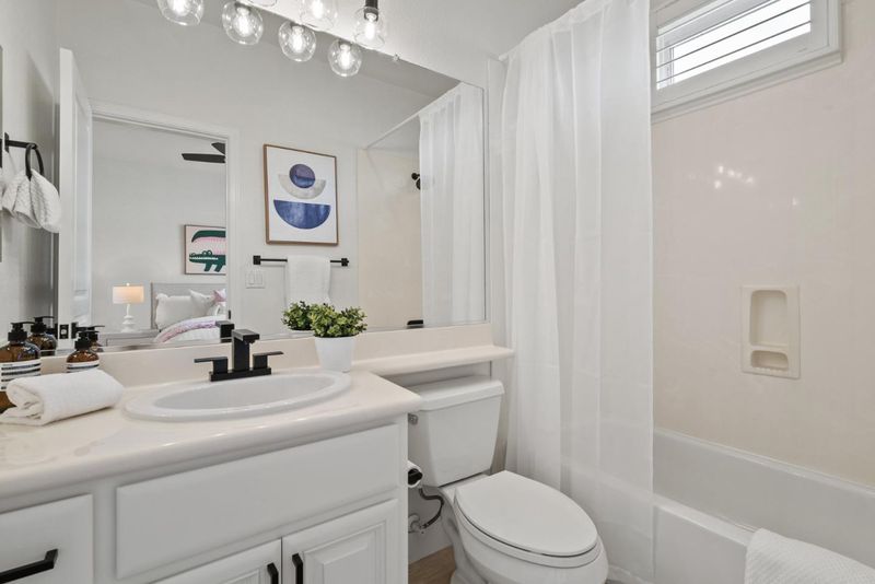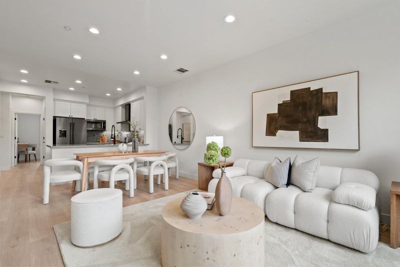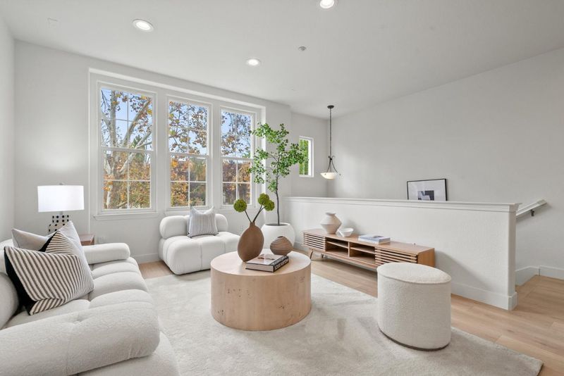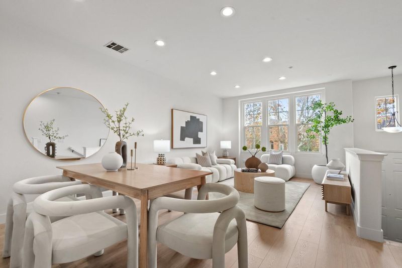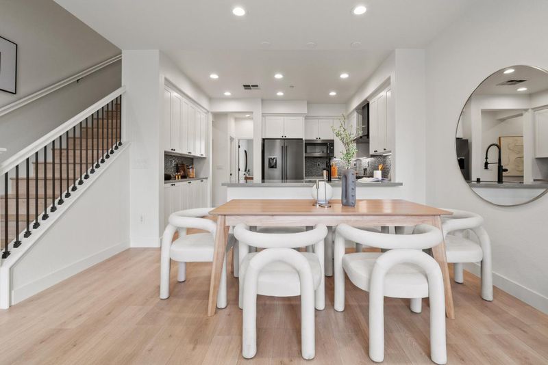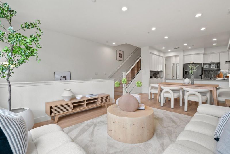 Rarely does a Rivermark home like this come on the market a modern retreat where every bedroom has its own full bath, ideal for roommates, in-laws, or multigenerational living. Sunlight fills the open living and dining area, highlighting beautiful new laminate floors! The completely remodeled chefs kitchen features custom cabinetry, Quartz countertops, a mosaic backsplash, and Bosch black stainless steel appliances for both elegance and performance. A main-level bedroom and bath offer flexible space for guests or a home office, while upstairs, the primary suite delivers a spa-like escape with dual sinks, soaking tub, and frameless glass shower. Modern touches such as black-finish hardware, smart thermostats, and multi-zone AC ensure comfort and sophistication throughout. Steps from parks, trails, Rivermark Plaza, and Silicon Valley employers, this home combines rare design, luxurious finishes, and an unbeatable location.