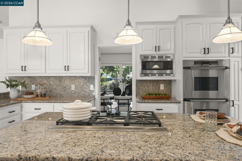 - Dishwasher, Double Oven, Gas Range, Plumbed For Ice Maker, Microwave, Refrigerator, Self Cleaning Oven, Dryer, Washer, Breakfast Bar, Breakfast Nook, Counter - Solid Surface, Stone Counters, Eat-in Kitchen, Disposal, Gas Range/Cooktop, Ice Maker Hookup, Kitchen Island, Self-Cleaning Oven, Updated Kitchen